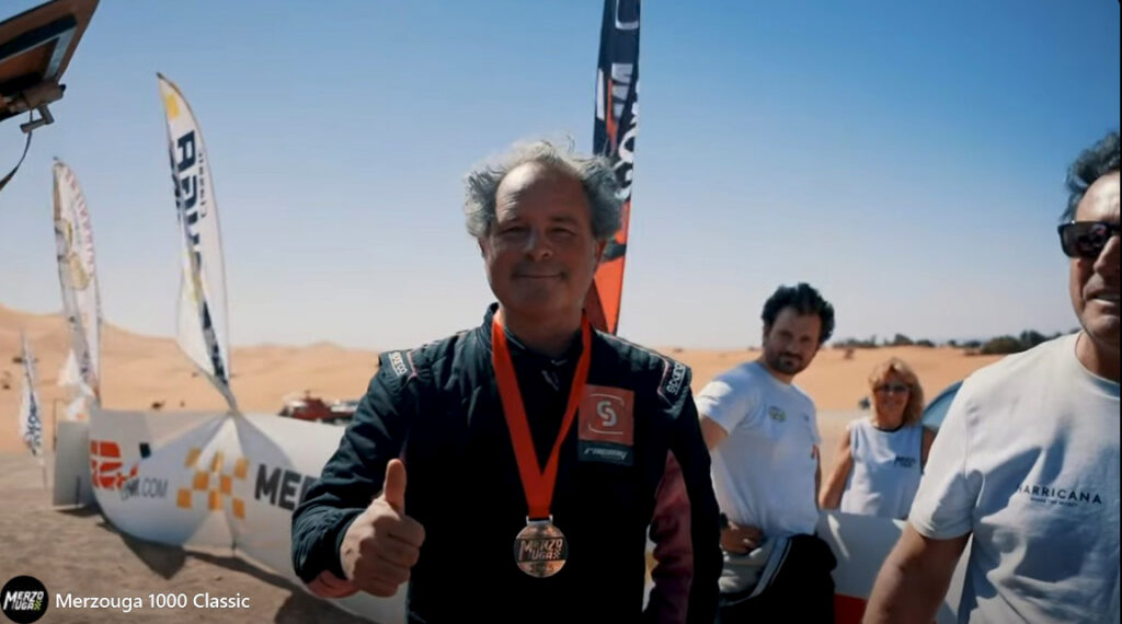 A refaire sans nul doute , la vitesse me plaisant plus que la régularité. Le Rallye MERZOUGA 1000 que j’ai eu la chance de faire avec mon fils Alfonso, 18 Ans , s’est déroulé comme la vie , avec des hauts et des bas , pour un bilan plus que positif . Nous repartons ravis car la MERZOUGA 1000 allie à mes yeux toutes les caractéristiques rendant l’expérience des meilleures : courte durée (5 jours intenses), tracés techniques et paysages variés aussi beaux les uns que les autres (pistes empierrées, sablonneuses, dunes, remontées d’oueds, erg, champs de pierre, pistes type WRC), très bons hôtels, équipe d’assistance sympa et dévouée (un Grand Merci à eux car je les ai fait bosser nuits et jours), concurrents sympas et solidaires, très bonne organisation sportive et médicale, encadrée par une très sympathique équipe de bénévoles totalement dédiée et dévouée et un hélico.